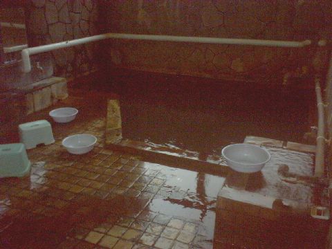 男性用内湯。広さは無いし洗い場も少ないが、湯は流しっぱなしの「正しい温泉」。飲用も可。 画面奥に見えるパイプで湯を引き込んでいる。