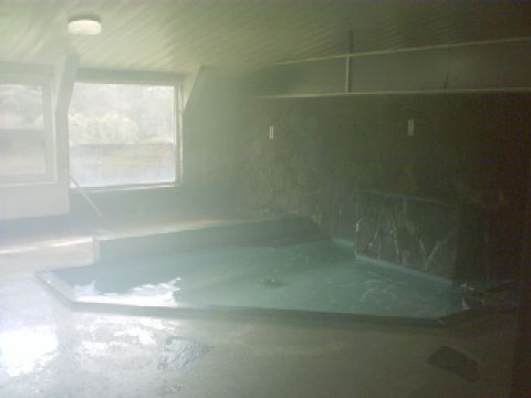 この写真では見難いが奥に見える窓の下に源泉のお湯を溜めた浴槽がある。ただし掛け流しではなく取水口があるので循環濾過なのかもしれない。
