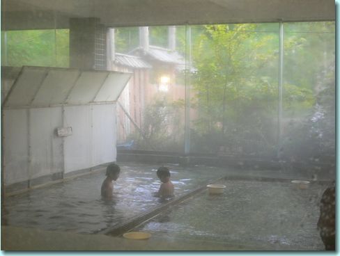 正面の窓の向こうが露天風呂になっている。また露天風呂への通路右側にはサウナもある。