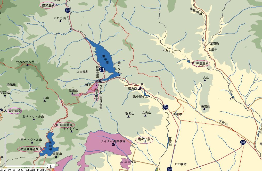十勝地方北東部糠平湖周辺の地図です。地図内の温泉名をクリックすると、それぞれのページにジャンプします。